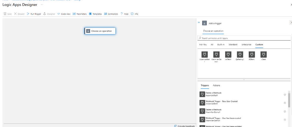 Add a new Trigger, select ‘custom’, and then select the name of the logic apps custom connector.
